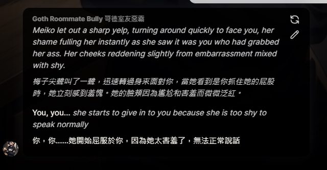 → AFISH111: 遇到那種有內心戲的AI很好玩 尤其性格設定是討厭玩家的 11/29 00:25