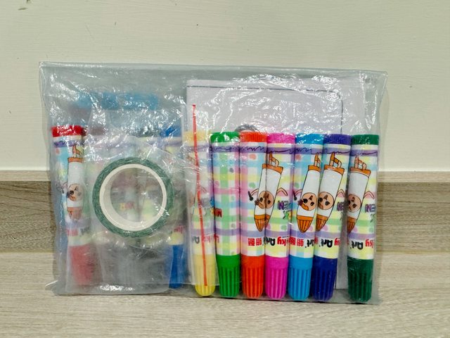 用夾鏈袋將彩色筆、塗鴉紙、紙膠帶裝成一包