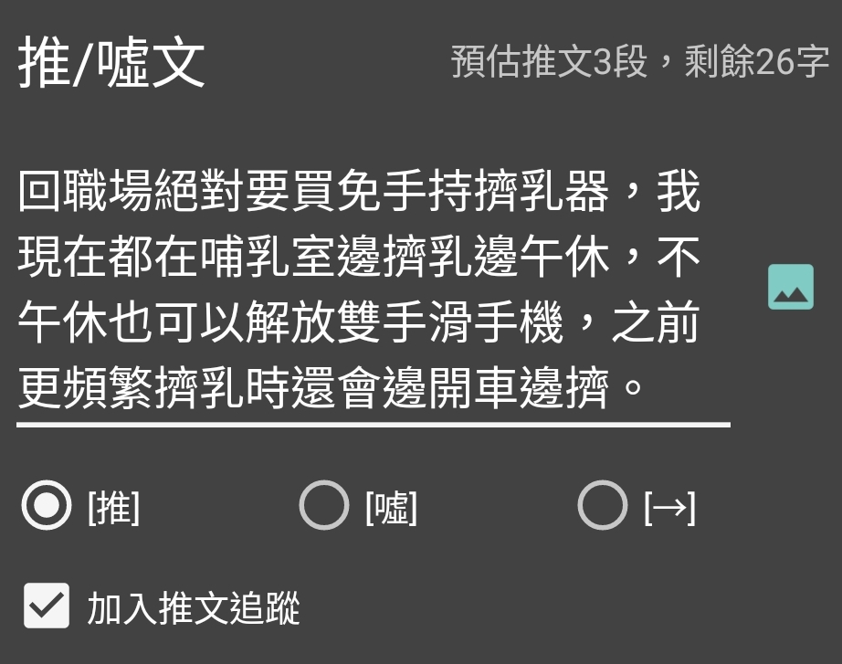 → mimix1986 : 反正不管有線無線,集乳完一定都還要再自擠排空, 12/05 14:04