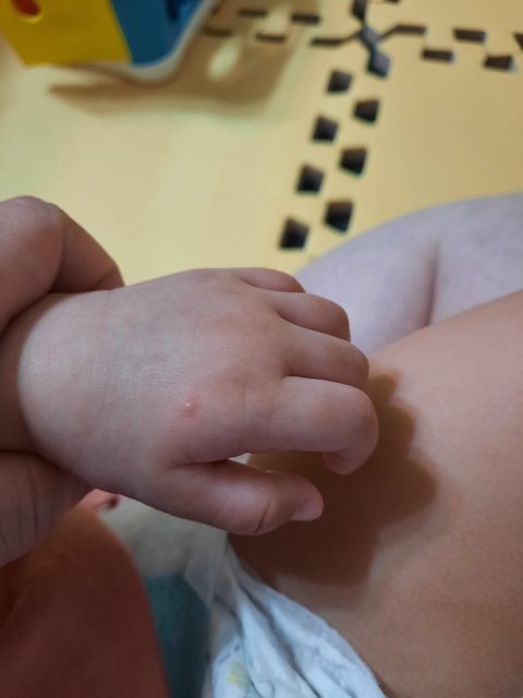 可是,到了隔天還是有,就覺得有點奇怪,但還是觀察,前幾天好不容易好一點,結果不知道為什麼隔天就忽然變成這丘疹狀,女兒手手皮皮,抓破一顆立刻流血,他好像也不會癢。