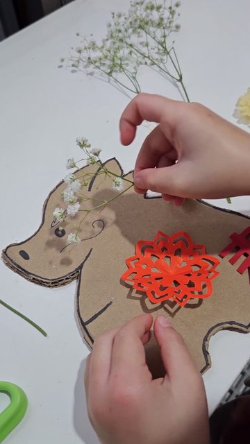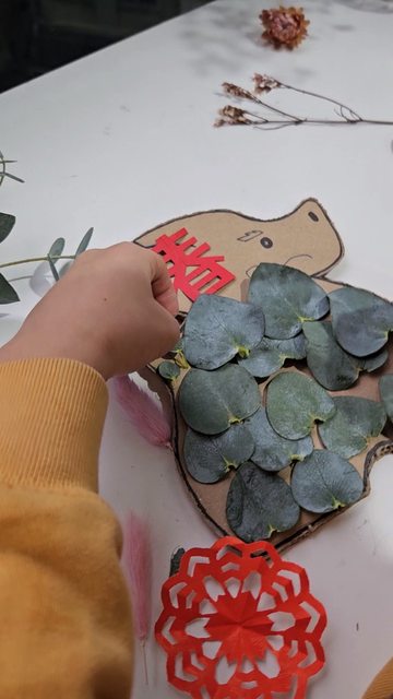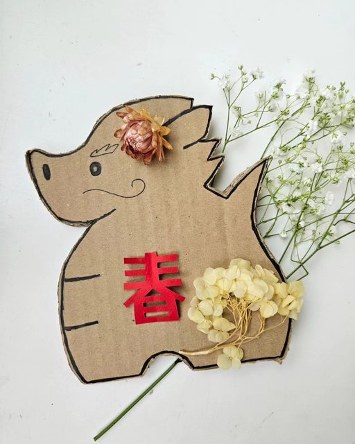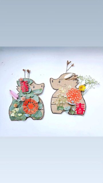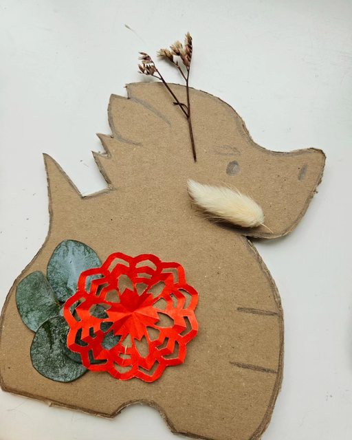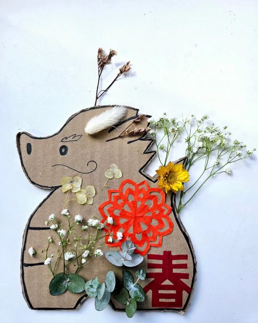 材料:龍土鈴造型紙板、窗花剪紙、乾燥花材