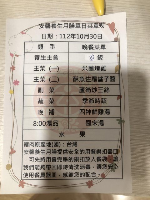 一直聽說月子餐份量很多會吃不完,所以住院期間月子餐我只有訂早餐及晚餐。月子餐廠商是安馨,每天會以保溫餐袋把食物送到房間,也都有附上今日的菜單。懷孕期間就很有興趣,還真的讓我吃到了。我覺得超好吃阿!! 連燉湯的雞肉都不柴,入口即化。