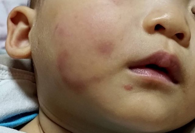 下班去接寶寶的時候發現左右臉頰嘴角旁各有一個小瘀青,直徑大概1cm,顏色紅紅的,當