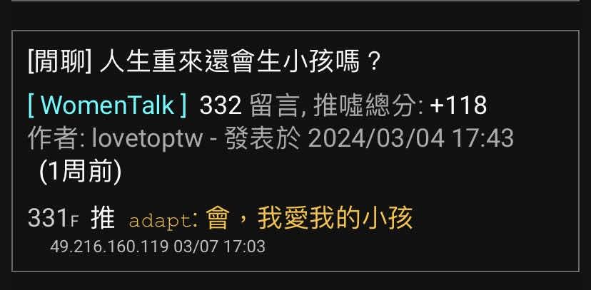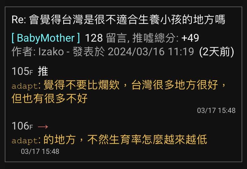噓 adapt : 覺得台灣很多地方的確不適合生育小孩,不代表我會因 03/18 13:13