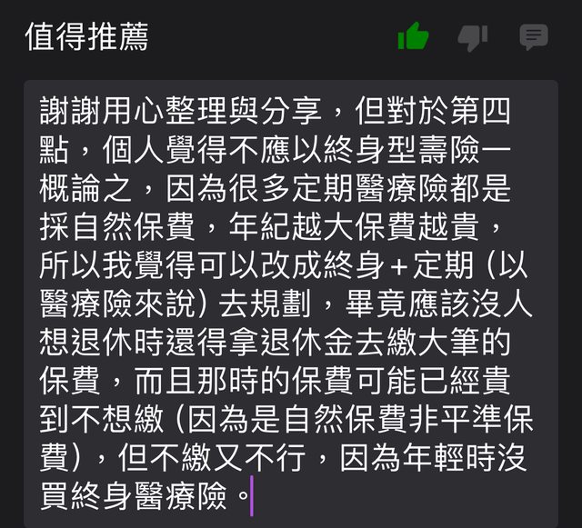 推 hsingyi : 借文 想問一下大家 各位覺得終身型醫療險年輕時買 03/16 09:12