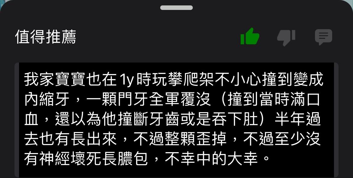 推 iaababg : 我家也撞到牙齒2次…牙醫說撞到當下去看牙醫 沒有 04/26 20:25
