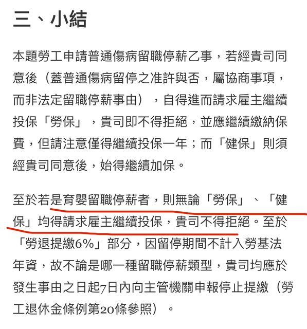 推 yl013 : 1.員工育嬰留停要續保,公司不得拒絕,依據是前面大 06/06 09:37