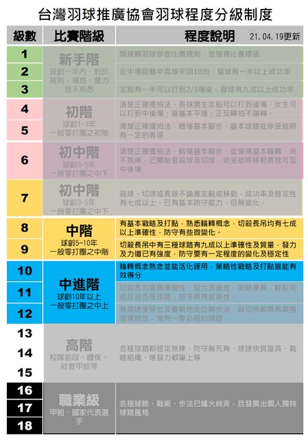 依照台灣羽球推廣協會等級