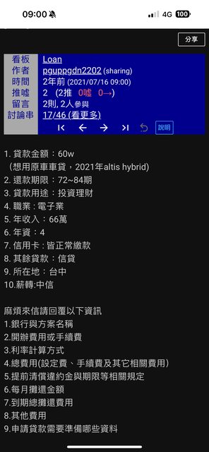 → DreamRush152: 認真說,車貸利率其實不高,唯一的缺點是轉手問題 12/20 09:14