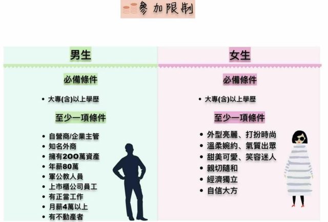 : 男生須年薪超過120萬以上且擁有正職之單身人員即可報名
