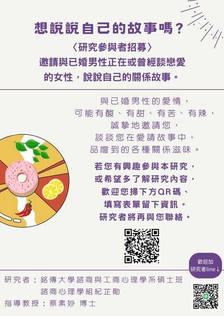 如果您有興趣透過說說您的愛情、關係經驗,為自己梳理心情、感受,歡迎您參與本研究。