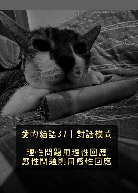 等的話都是,千萬不要用理性去檢視話語內容,而是要讓內心感覺盈滿,充滿一種情懐。反之,關注在伴侶話語內容的「正確與否」、是否「解決問題」,是否合於理性邏輯,常屬於「理性回應」。這種回應不是不對,甚至是富有邏輯,但在語言對話的脈絡上不對味、不合拍,除了破壞當時對話的氛圍,也常成為兩人間相處沈默的因素(畫上句點)