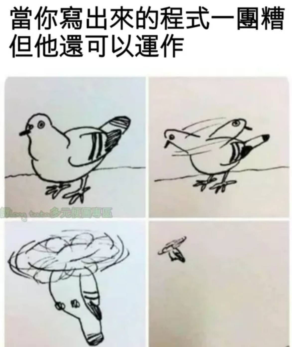 推 lsd25968: 一分前:狗屎code快跑啊 一分後:狗屎code為啥能跑 07/10 17:45