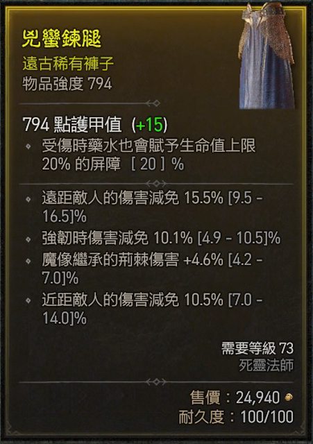 標題[競標] D4賽季 死靈3減傷受傷屏障褲(遠、近、強