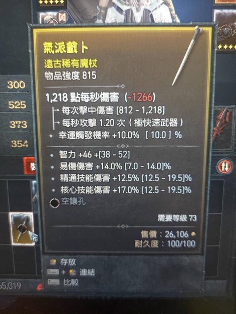 物 品:S1法師單手杖 精通核心智力頂易傷 物品強度815