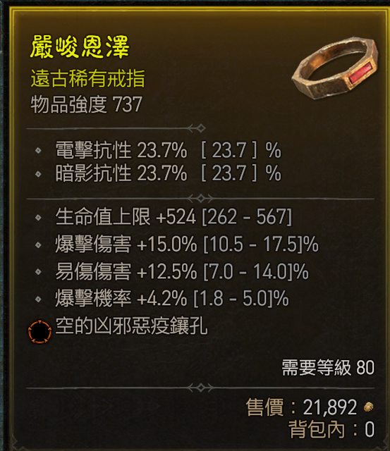 標題[競標] D4 S1 戒指 生命/易傷/爆擊/爆傷 兇邪