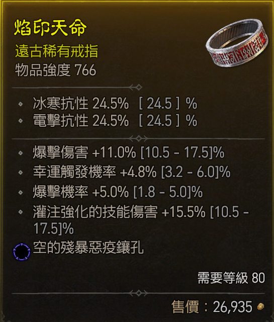 物 品:D4 S1 戒指 頂爆/高幸運/高灌注傷 殘暴(藍)孔