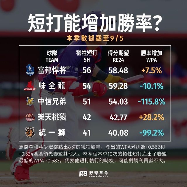 : 如果從球隊角度來看的話,本季短打產出的WPA,最高的竟是聯盟犧牲觸擊次數第二少的樂