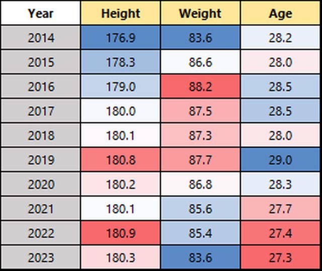 標題[討論] 中信兄弟近十年野手平均身高/體重