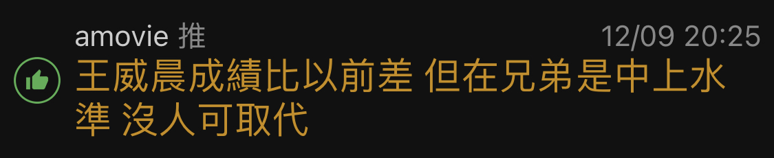 推 amovie: 王威晨成績比以前差 但在兄弟是中上水準 沒人可取代 12/09 20:25