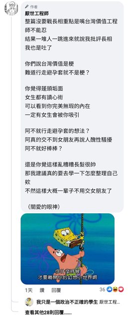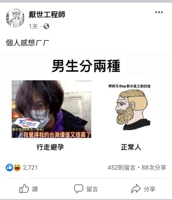 厭世工程師常常批鬥國民黨、民眾黨仇女,結果他自己是怎麼樣的人呢?