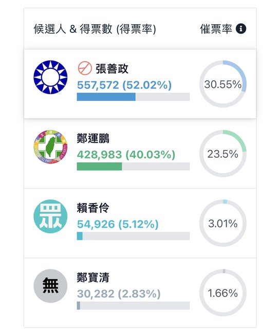推 keygo: 很多賴的支持者是含淚投張善政的 1.200.45.86 12/17 15:08