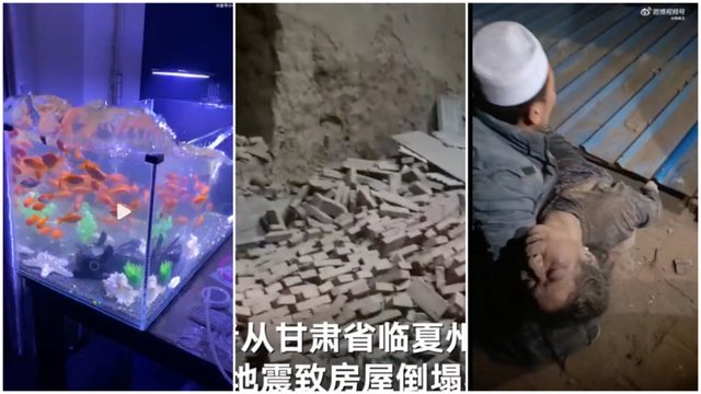 網友拍攝的視頻以及監控錄像顯示,震區地面劇烈晃動,有民眾家中魚缸的水被晃出來。