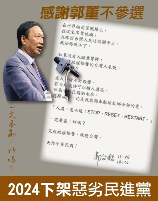 郭董為實現政權輪替而勇敢參選,然而他選擇默然退選,凸顯了對台灣未來發展的重視。