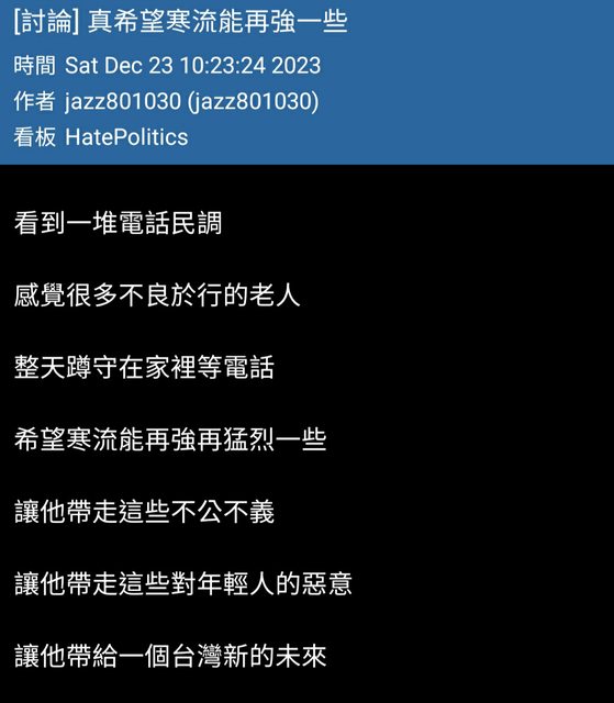 → inlanyu: 3%的老人換算也不少了 柯粉真要他們全死? 114.27.204.122 12/23 11:18