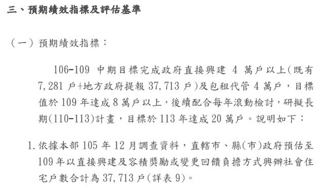 都是包租代管和興建公宅,兩者加起來盼達到20萬戶目標,其中,政府直接興建12萬戶、