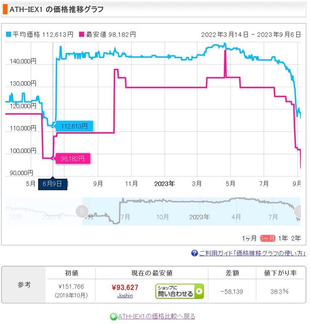 鐵三角三年前出的旗艦入耳式耳機目前日亞折扣加運費與預繳關稅日幣92,386元,換算台幣大概兩萬,根據價格.com的圖表應該是相對低價(或者還有更低lol),不知道台灣會不會也有這樣的出清價