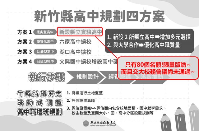 : 四個方案計畫,竹縣預計116學年度可增加供應24-27班,共840-920名額,同時也期待