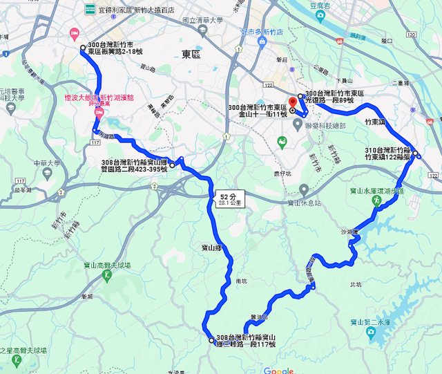 : 在寶山水庫左轉下山在二重埔接竹東中興路左轉,