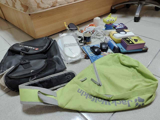 物品項目:包包、拋棄拖鞋、鞋拔、滑鼠、藍芽喇叭、充電線、多頭充電、全新便當盒、