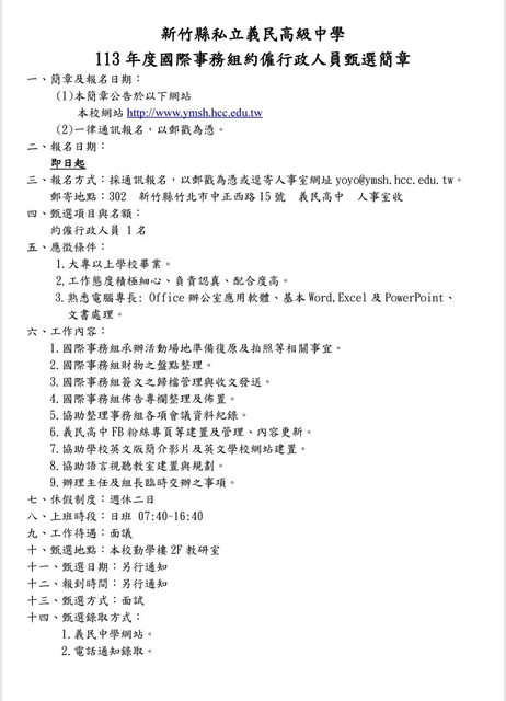 標題[情報] 義民中學國際事務組約聘人員徵才