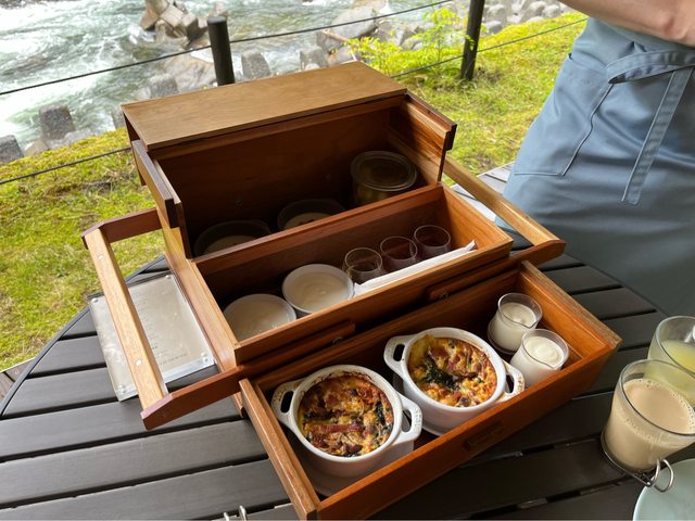 早餐是加價1,300円在西館1樓享用溪流旁早餐。看座位約10組,難怪預約單上多顯示客滿