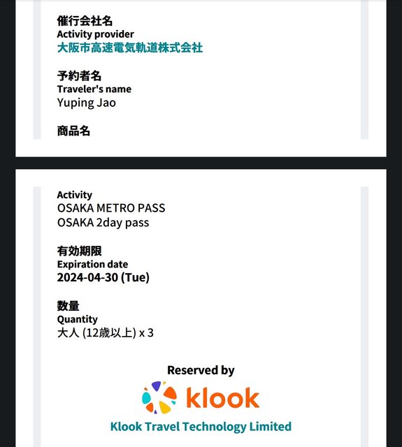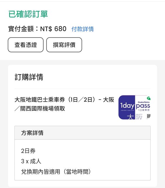 標題[讓售] 大阪地鐵巴士乘車券(二日)3張
