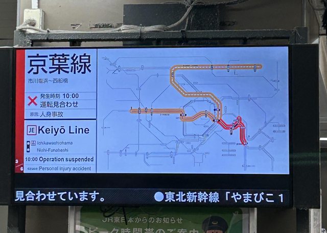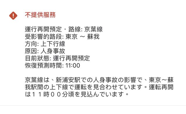 10點到新浦安車站發現只出不進,人潮擠在服務台,發現停駛,因為發生人身事故,還好不