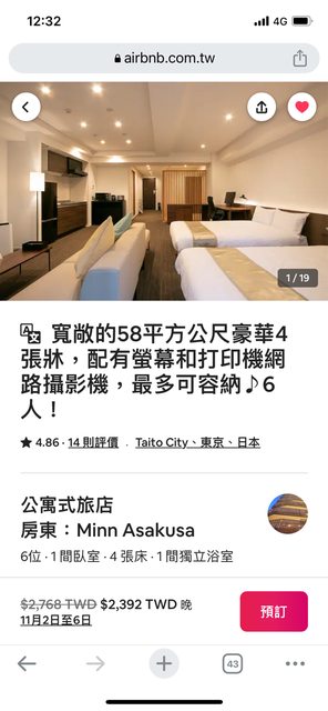 → a0927666181 : 房,床合在一起可以睡4人,4晚包含星期五六共1萬9千 08/10 20:34