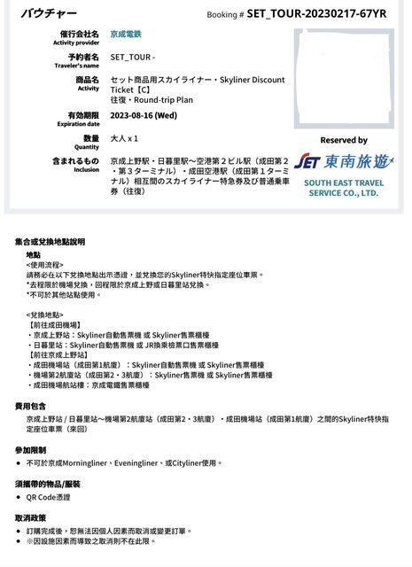 Skyliner京成電鐵車票2張(來回)(不拆售)