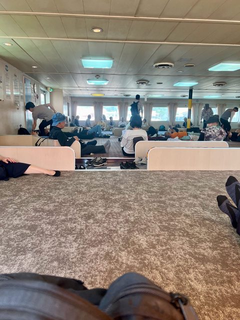 到乘客們各自拿一塊枕頭,各據一地,倒頭大睡的情景。躺個兩個半小時就可以到隱岐啦