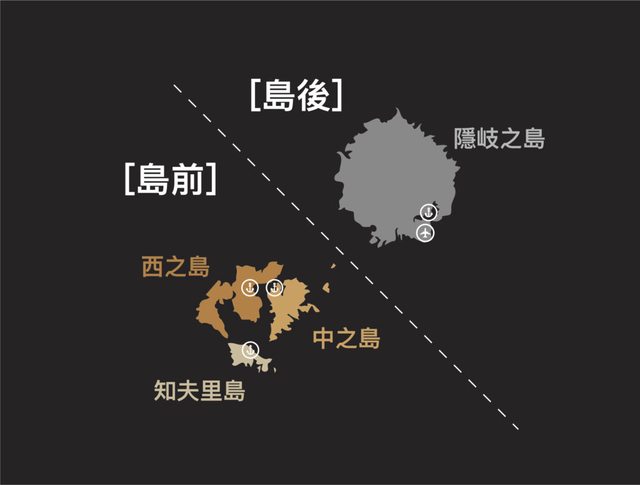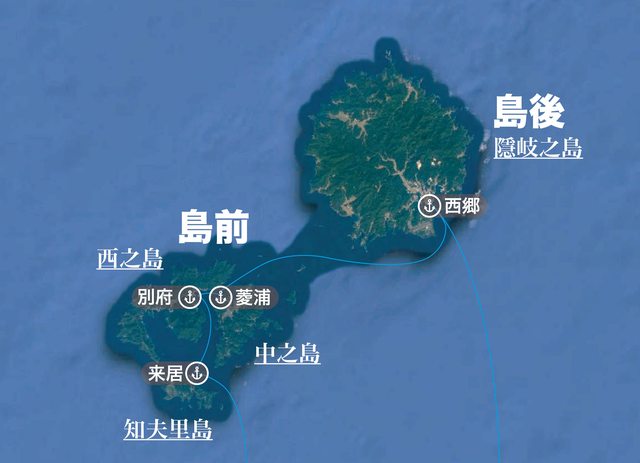 隱岐之島的港口是「西鄉港(西郷港)」,中之島的港口為「菱浦港」、西之島的港口為