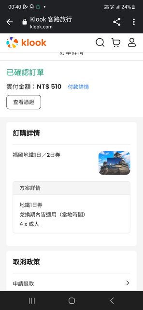 標題[讓售] 福岡一日地鐵劵klook*4張