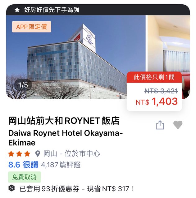 推 likeilike : 請問APA岡山站前和AreaOne 有推嗎? 08/15 08:30