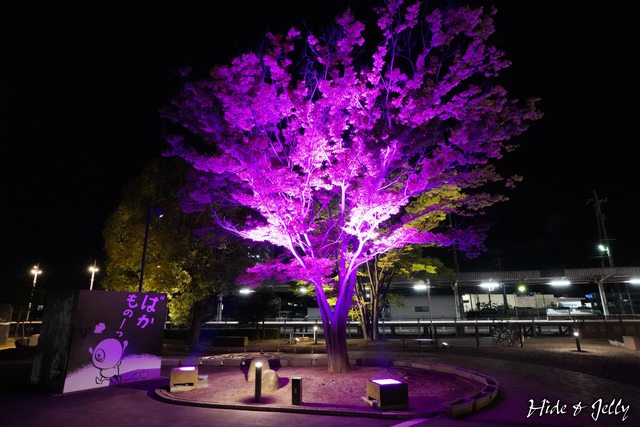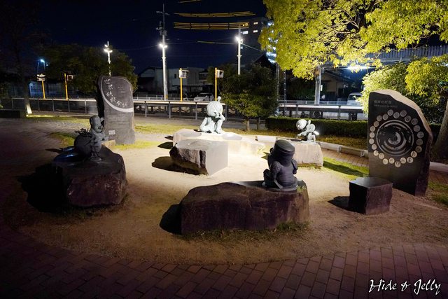 快回到車站的位置,還有一個妖怪公園,夜間也會打上燈光,一旁還有告示,「這裡是妖