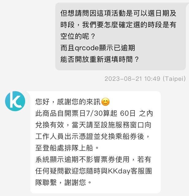 (1)原預定8/13使用,但因行程未使用到,詢問客服表示從開票日7/30算起60日之內(9/27)兌換有效,qrcode顯示逾期不影響票券使用,經兌換後1日之內有效,逾期無效。
