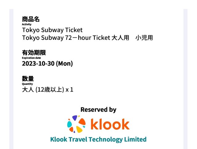 東京地鐵通票72小時 大人券一張,期限(2023/10/30)