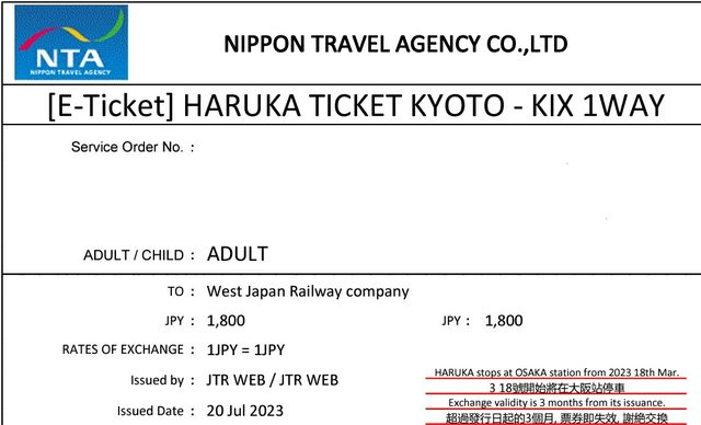 1. 讓售品項:HARUKA 京都車站-關西空港 (單程3張)