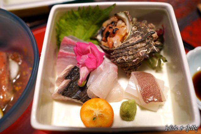 一開始擺在桌上的彩色寶箱,原來是生魚片們啊,包含一整顆大蠑螺、花枝與三種魚類共