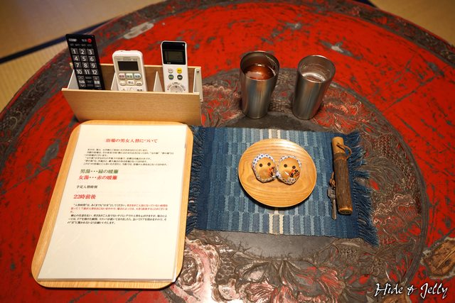 圓桌上擺著電視、空調、燈光的遙控器,還有男女溫泉交換的須知,附贈的小點心則是這